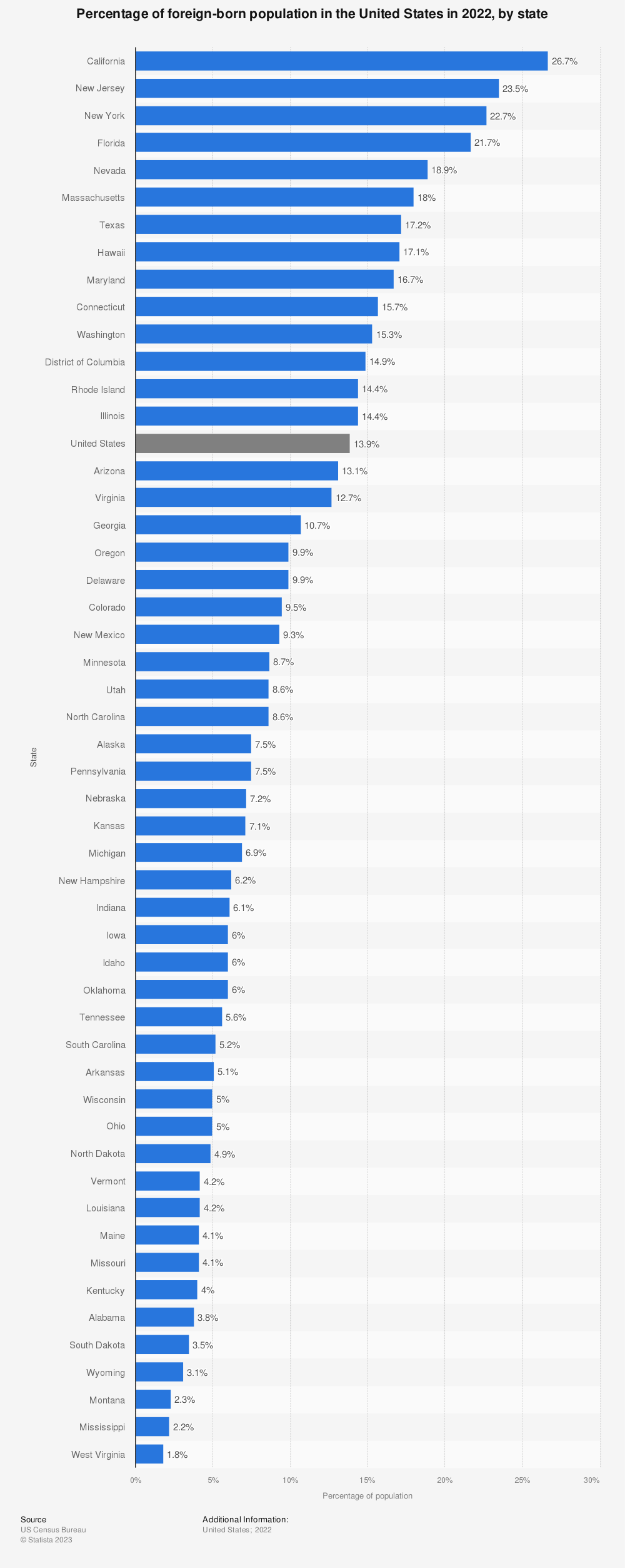 As of 2022, California had the highest percentage of foreign-born residents in the United States, with 26.7% of its population born outside the country. Following California, New Jersey, New York, Florida, and Hawaii also had significant populations of foreign-born residents. Nationally, 13.9% of the U.S. residents were born in another country. This data highlights the diverse demographic composition of these states and their role as major destinations for immigrants in the U.S.