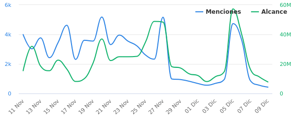 - Las estadísticas de alcance y AVE se correlacionan con el volumen de menciones, indicando que los días con más menciones también tuvieron una mayor exposición de la audiencia y valor de cobertura mediática.