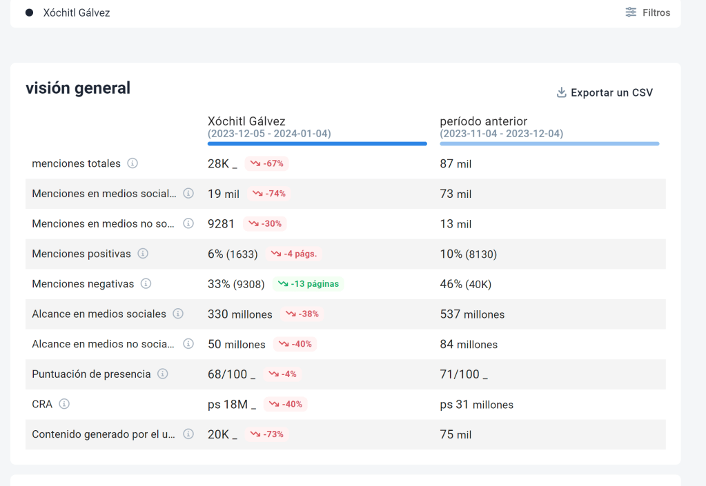 - Xóchitl Gálvez muestra una disminución considerable en todas las métricas, con un aumento preocupante en el sentimiento negativo.